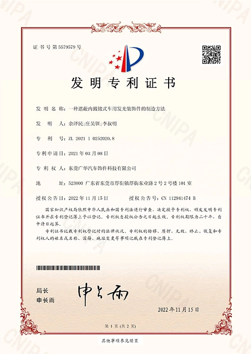 In 2021Patent for Light-transmitting Metal Automotive Trim Manufacturing -
