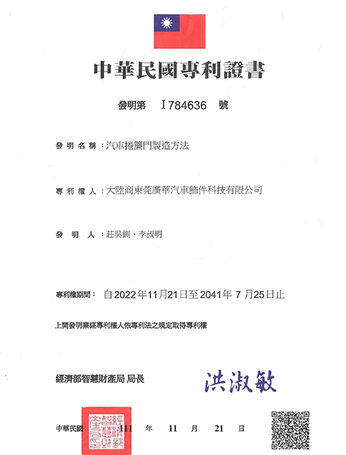 In 2022Patent for Automotive Roller Shutter Manufacturing -