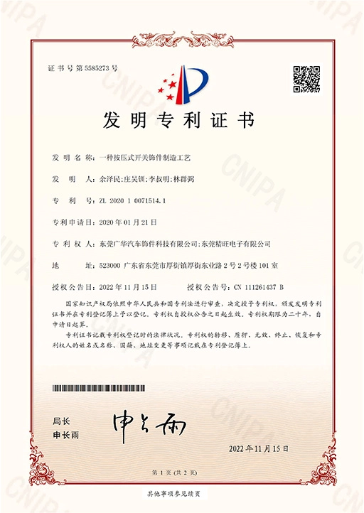 In 2020Patent for Manufacturing Process of Push-button Switch Trim -